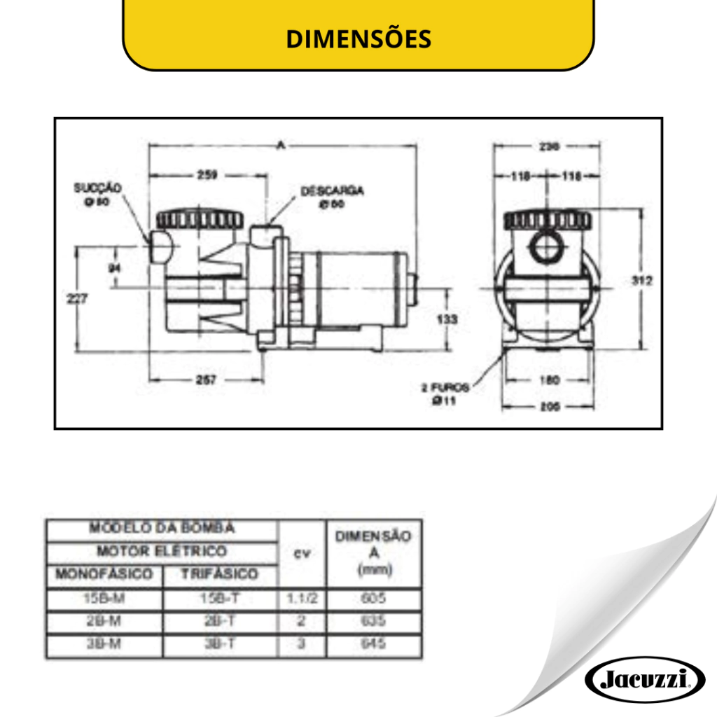 São dotadas de base de assentamento em material termoplástico montada no corpo da bomba por meio de dois pinos. A base absorve vibrações e mantém o motor afastado do piso da casa de máquinas, evitando sua corrosão. Os bocais de sucção e descarga possuem bitola de Ø60 mm (coláveis). Por serem auto-escorvantes podem ser instaladas acima ou abaixo do nível da água da piscina, dependendo do modelo do filtro. As bombas da série B têm construção monobloco, com motor elétrico para redes de freqüência 60 Hz monofásico (127/220 V) ou trifásico (220/380V). Os motores são protegidos contra quedas de gotas d´água na vertical (grau de proteção IP21).