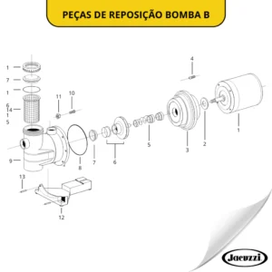 As bombas da série B são centrífugas, auto-escorvantes, com pré-filtro incorporado, utilizadas com os filtros de areia da série TP, FC e SC, conforme mostrado na tabela abaixo. O corpo e o pré-filtro são construídos em ABS, o rotor em Noryl e a tampa do pré-filtro em SAN, fixada ao corpo do pré-filtro por meio de um anel roscado construído em ABS. A tampa do pré-filtro é transparente, permitindo que, sem removê-la, possa ser feita a inspeção do cesto coletor, também construído em material termoplástico. A vedação é feita por meio de selo mecânico montado sobre um prolongamento do cubo do rotor, o que impede o contato entre a água e o eixo do motor.